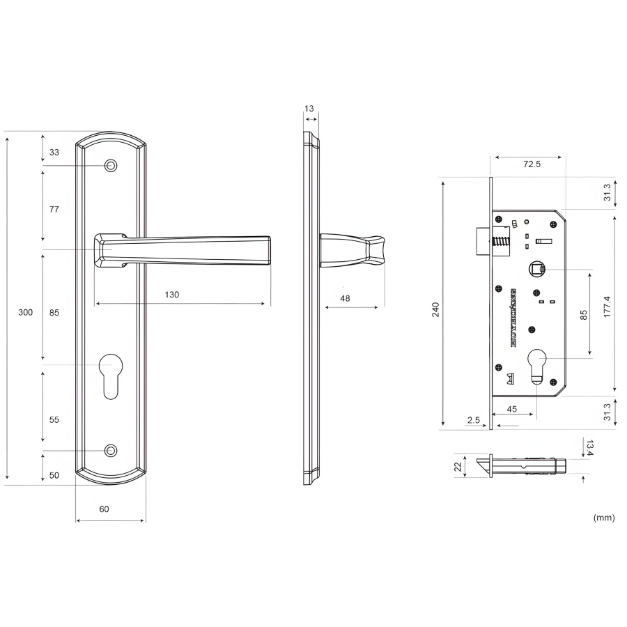 Chất liệu: Đồng thau (Tay ốp, Ổ khóa, Chìa, Bi), Inox (Thân khóa dày 1,5mm), Tôn thép mạ Zn.