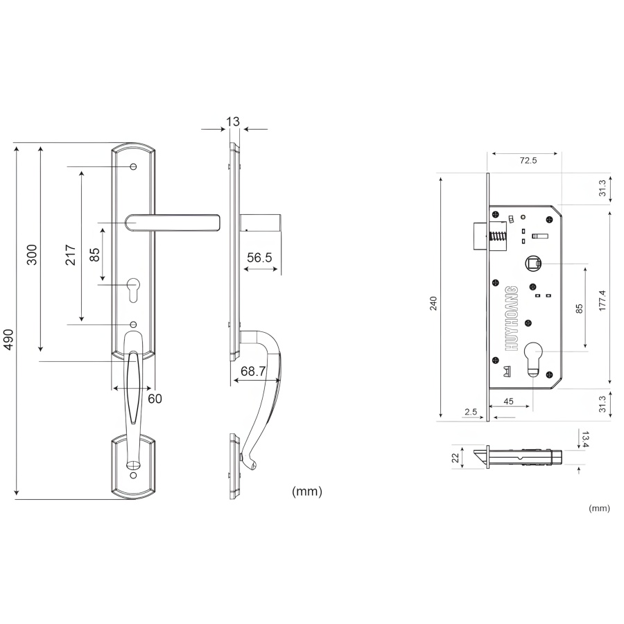 Chất liệu: Inox 304 (Tay ốp, Ốp phụ), Đồng thau (Then khóa), Thân Inox/Thép mạ Zn.