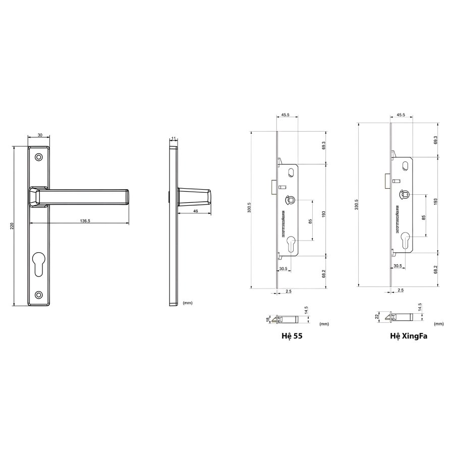 Chuyên dụng cho Nhôm Hệ Đa Dạng: Khóa có 2 phiên bản thân phù hợp với các loại nhôm hệ thông dụng (Hệ 55, Hệ XingFa) và 2 phiên bản ốp phụ phù hợp cho cửa 1 cánh hoặc 2 cánh.
