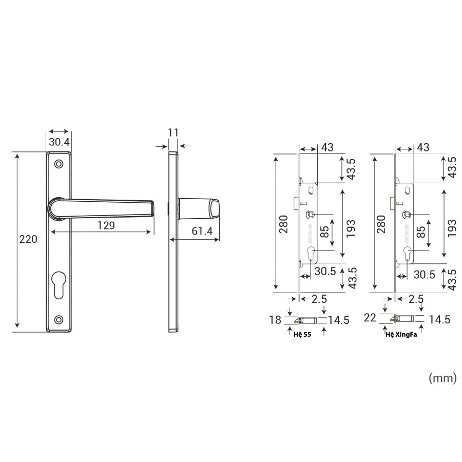 Chuyên dụng cho Nhôm Hệ Đa Dạng: Khóa có 2 phiên bản thân phù hợp với các loại nhôm hệ thông dụng (Hệ 55, Hệ XingFa) và 2 phiên bản ốp phụ phù hợp cho cửa 1 cánh hoặc 2 cánh.