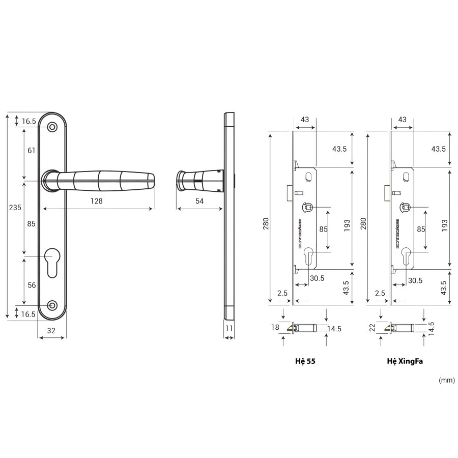Chuyên dụng cho Nhôm Hệ Đa Dạng: Khóa có 2 phiên bản thân (Hệ 55, Hệ XingFa) và 2 phiên bản ốp phụ (cửa 1 cánh/2 cánh), đảm bảo sự tương thích cao khi lắp đặt.