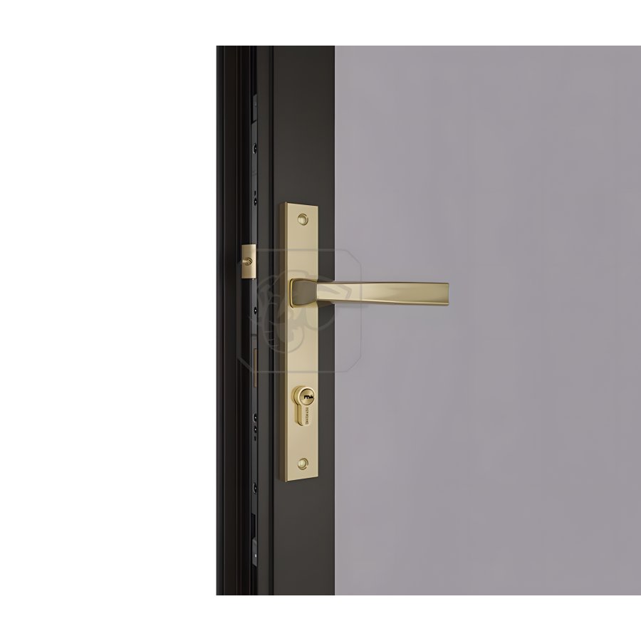 Thiết kế Đồng Thau Sang Trọng: Tay ốp khóa được sản xuất bằng đồng vàng (đồng thau), mang lại vẻ ngoài ấn tượng, sang trọng và khả năng chống ăn mòn tốt.