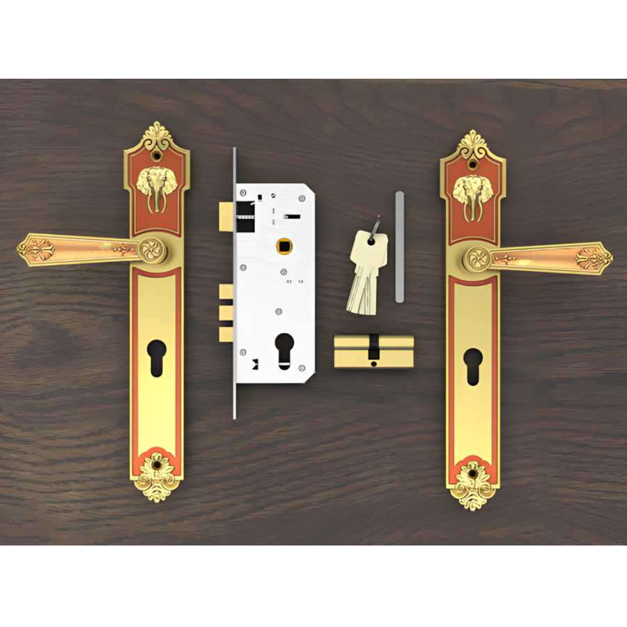 Chất liệu: Đồng vàng (Tay ốp, Then khóa), Tôn thép sơn tĩnh điện (Thân khóa).