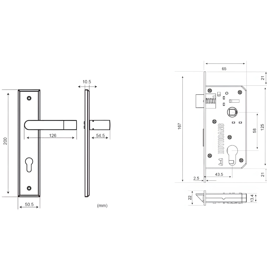 Chất liệu: Inox 304 (Tay ốp), Đồng vàng (Then khóa, Ổ khóa), Tôn thép mạ Zn (Chi tiết bên trong).