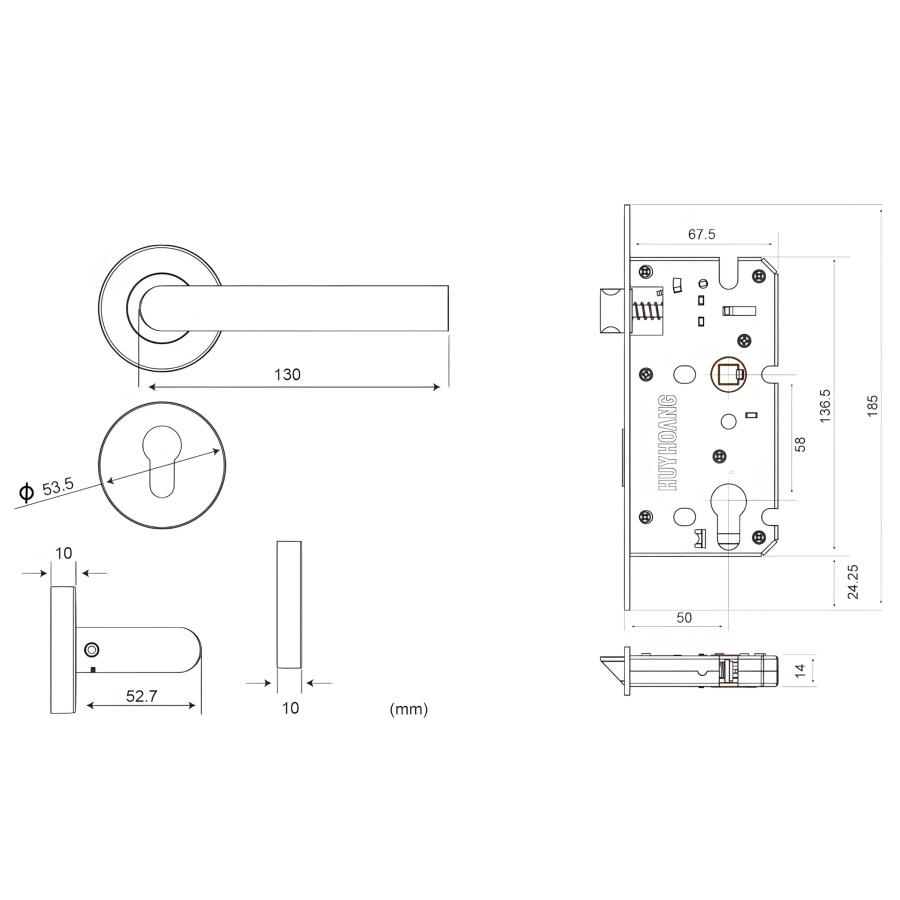 Khóa tay nắm Huy Hoàng SS 5810: Tay ốp Inox 304, màu Inox mờ (Trắng Bạc). Thân khóa 58mm, ổ đồng 3 chìa vi tính. Chống gỉ, phù hợp cửa thông phòng/WC.