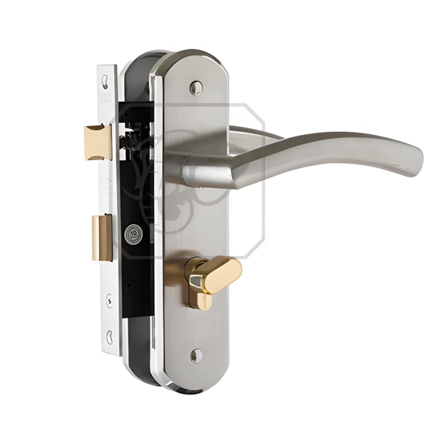Chất liệu: Inox 304 (Tay ốp), Đồng thau (Then khóa, Ổ khóa), Tôn thép mạ Zn.