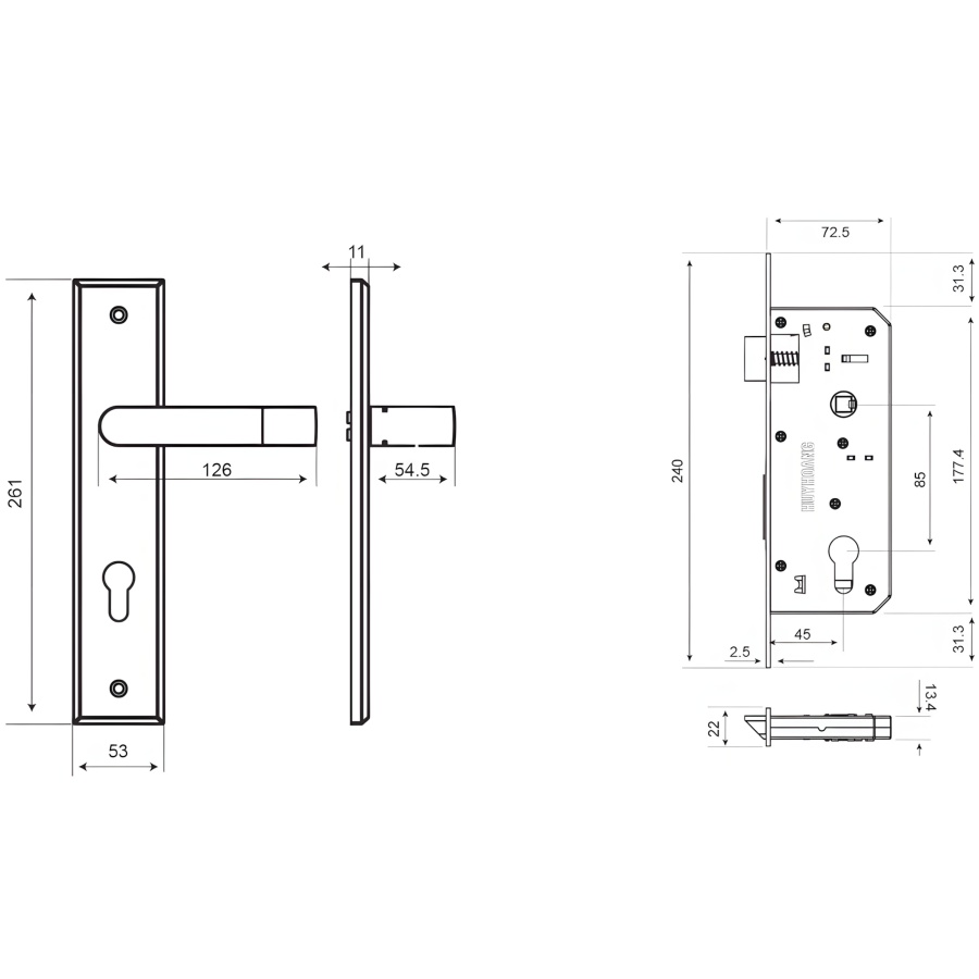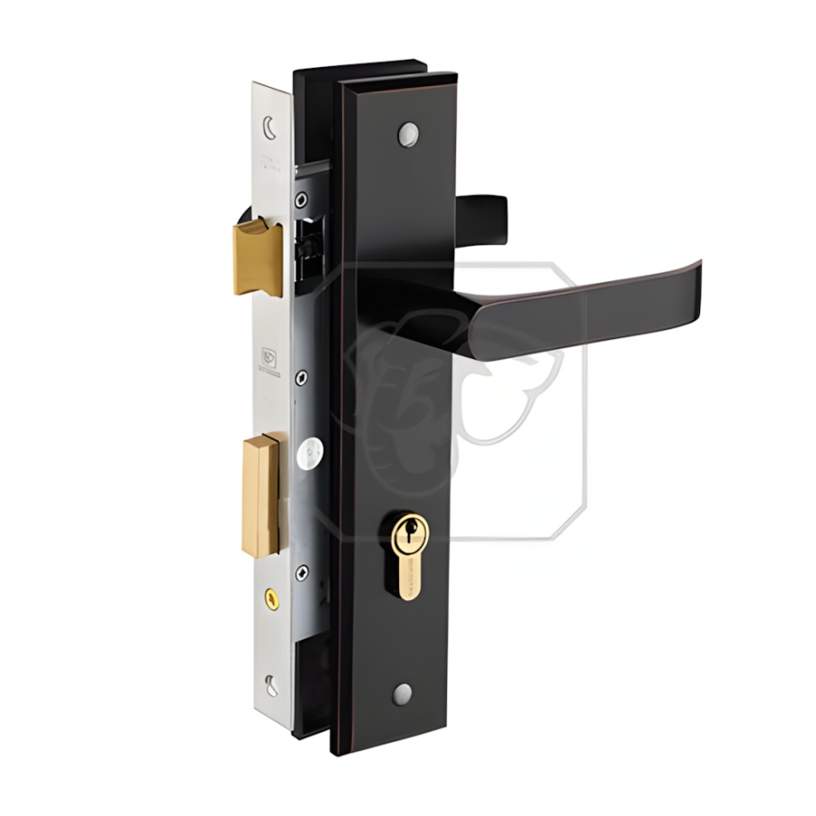 Chất liệu: Inox 304 (Tay ốp), Đồng vàng (Then khóa, Ổ khóa), Thân Inox/Thép mạ Zn.