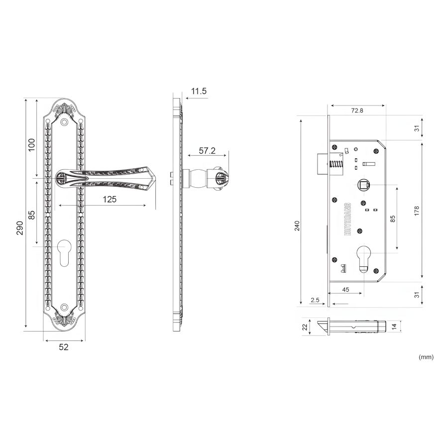 Chất liệu: Hợp kim ZDC-2 (Tay ốp), Đồng vàng (Then khóa, Ổ khóa), Thân thép 1.5mm mạ Zn.