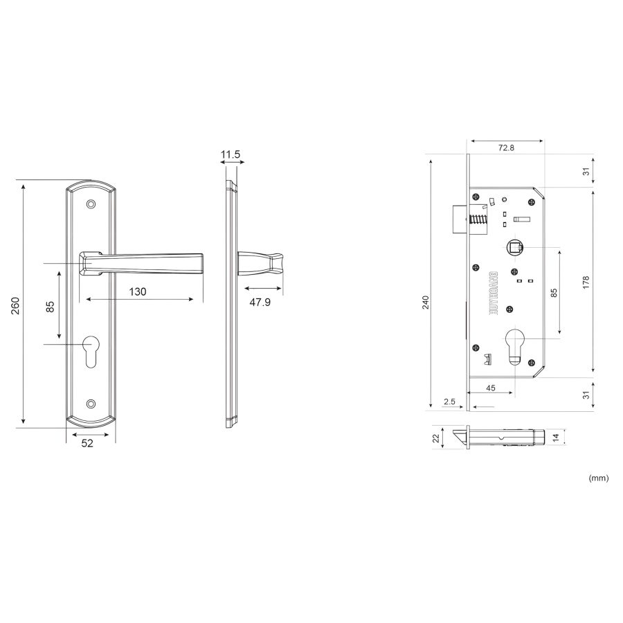 Chất liệu: Hợp kim ZDC-2 (Tay ốp), Đồng vàng (Then khóa, Ổ khóa), Thân thép 1.5mm mạ Zn.