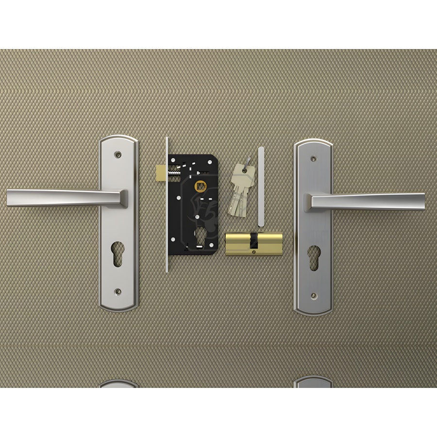 Chất liệu: Inox (Tay ốp, Mặt thân), Đồng thau (Then khóa), Tôn thép mạ Zn (Chi tiết bên trong).