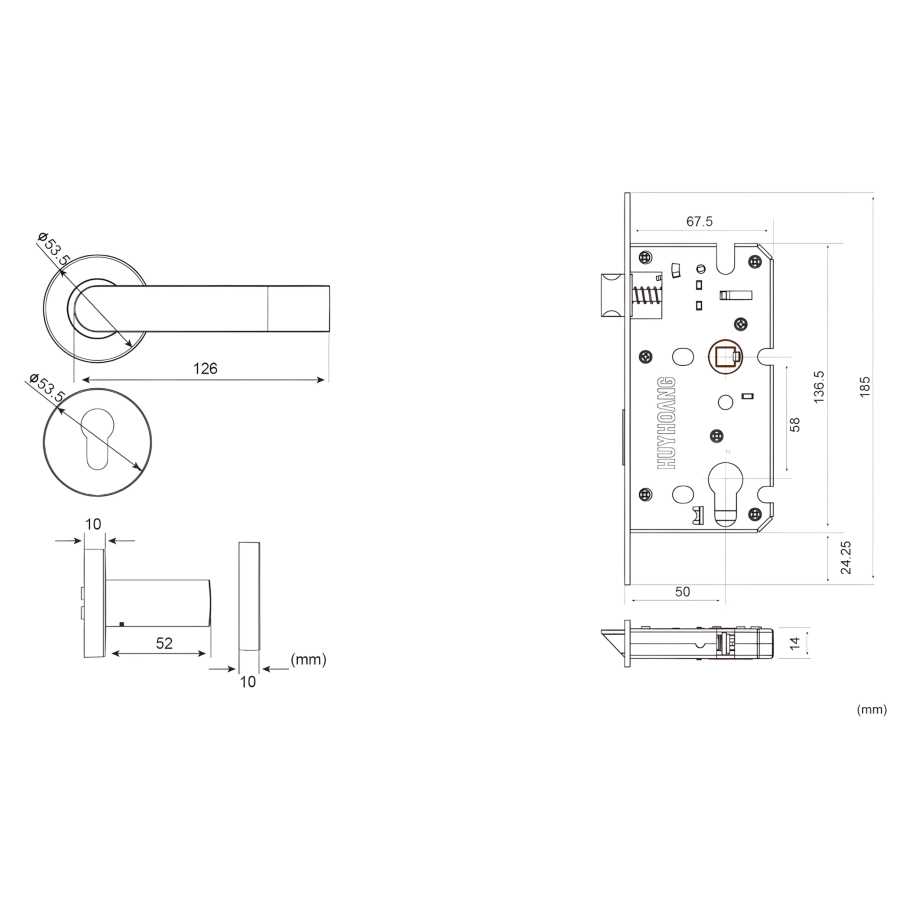 Chất liệu: Inox 304 (Tay ốp), Đồng vàng (Then khóa, Ổ khóa), Thân Inox/Thép mạ Zn.