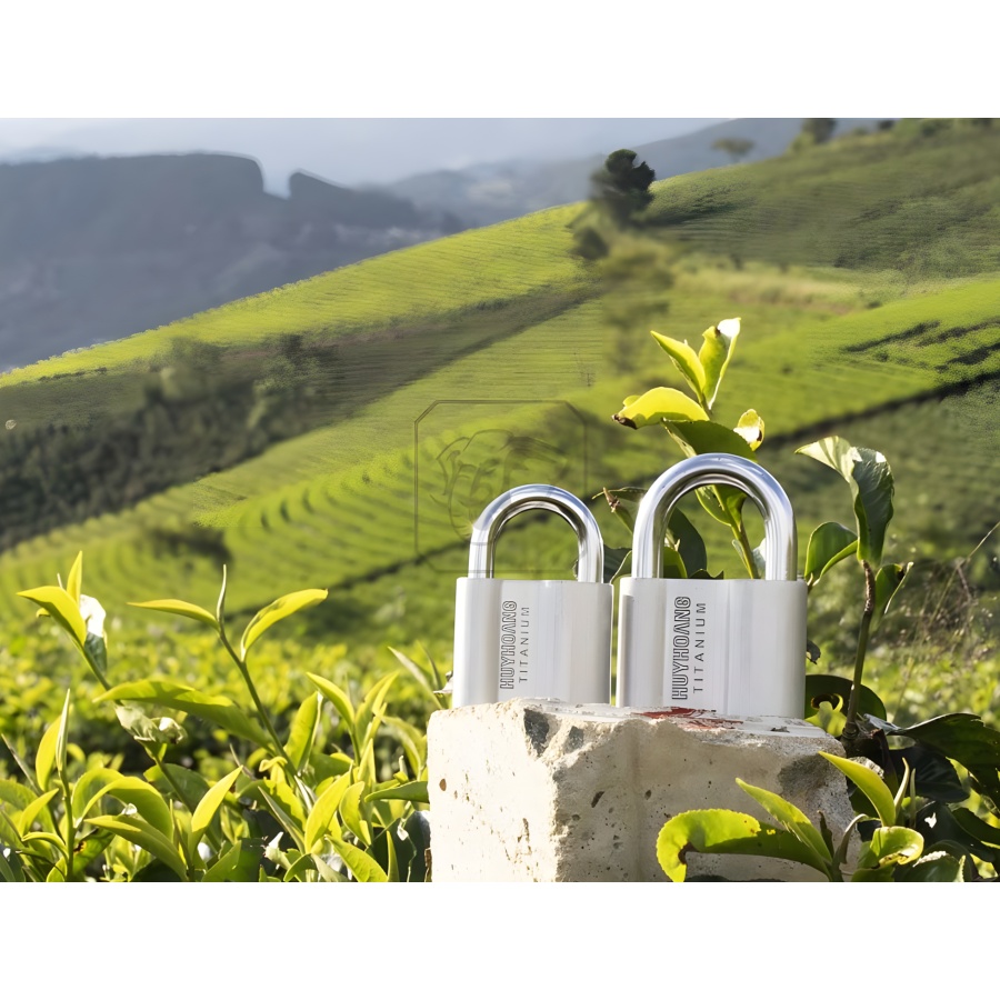 Khóa treo chống cắt Huy Hoàng Titanium 10 (KTCCTI10): Vỏ Titanium, cầu thép mạ Cr. Chìa vi tính 4 bi, khóa bấm không chìa. An toàn tuyệt đối, chống mài mòn mạnh mẽ.