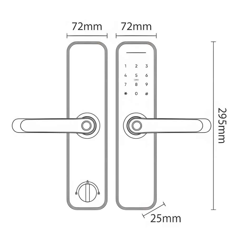 Kích thước thân khóa ngoài: R 72× C 295× D 25 mm.
