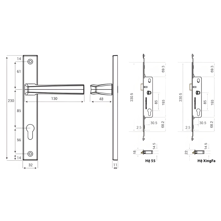 Chuyên dụng cho Nhôm Hệ Đa Dạng: Khóa có 2 phiên bản thân phù hợp với các loại nhôm hệ thông dụng (Hệ 55, Hệ XingFa) và 2 phiên bản ốp phụ phù hợp cho cửa 1 cánh hoặc 2 cánh.