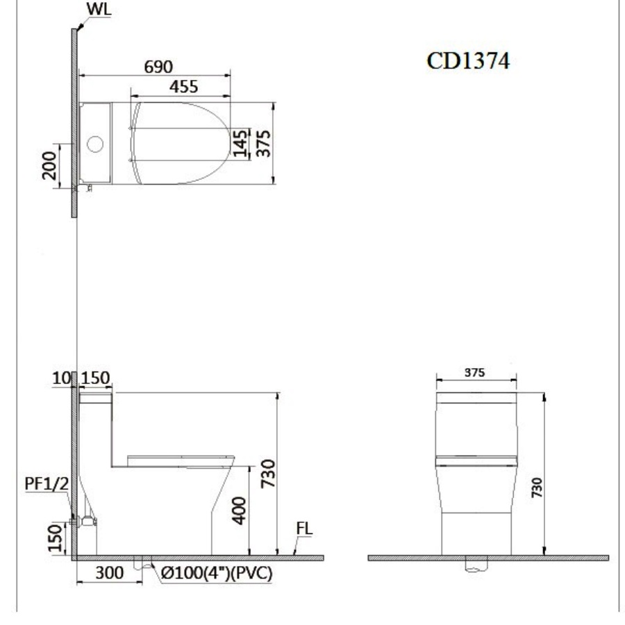 Kích thước bồn cầu (DxRxC): 690 x 375 x 730 mm
