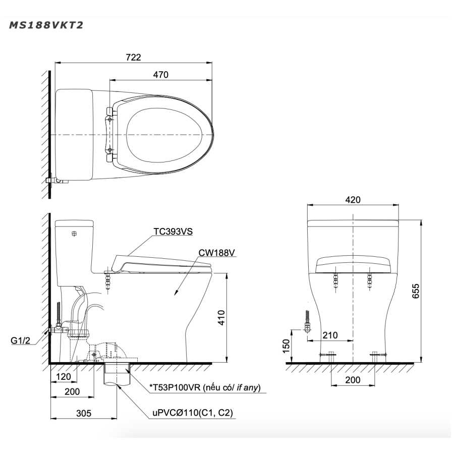 Bản vẽ kích thước bồn cầu liền khối TOTO MS188VKT2