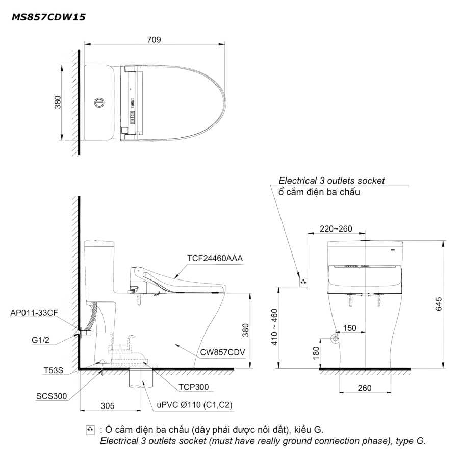 Bản vẽ kích thước bồn cầu Washlet TOTO MS857CDW15 nắp điện tử Washlet C5 TCF24460AAA