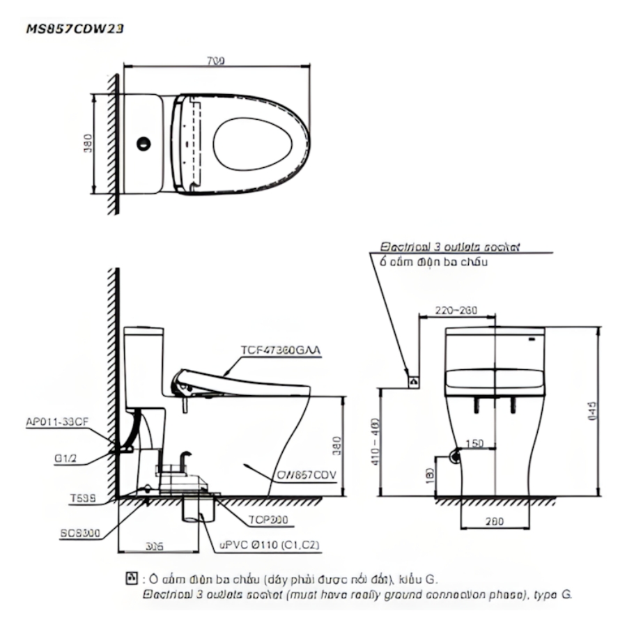 Bản vẽ kích thước xí bệt Toto MS857CDW23