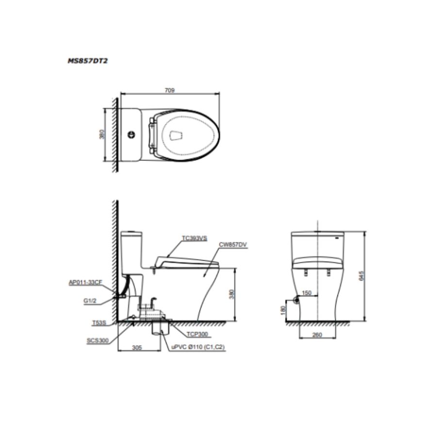 Bản vẽ kích thước xí bệt C857DT2 TOTO nắp êm TC393VS