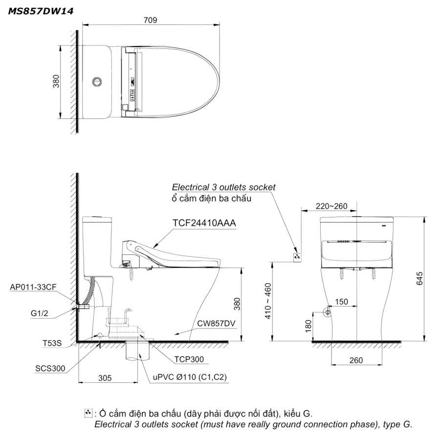 Bản vẽ kích thước bồn cầu Washlet TOTO MS857DW14 nắp điện tử Washlet C5 TCF24410AAA