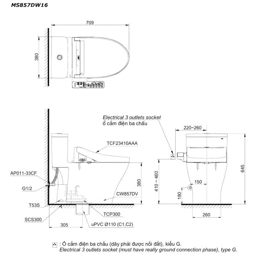 Bản vẽ kích thước bồn cầu Toto MS857DW16 nắp điện tử Washlet C2 TCF23410AAA