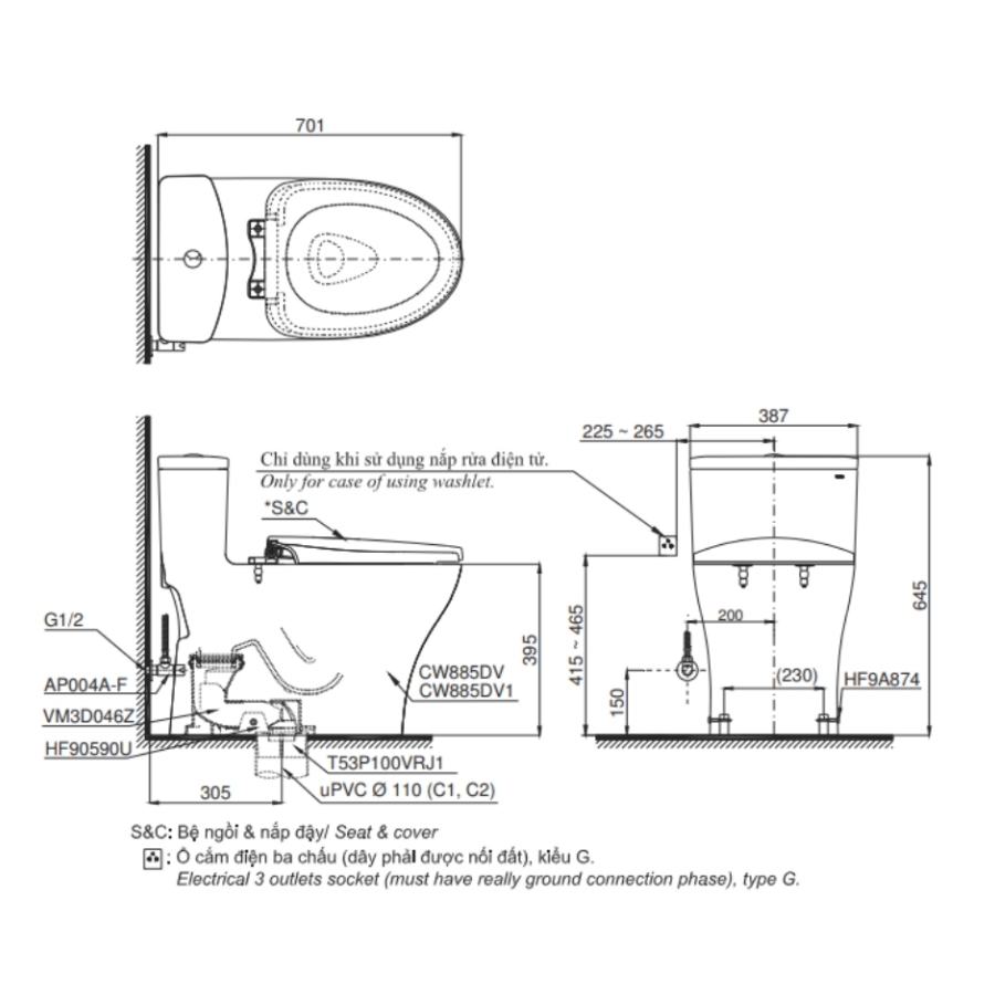 Bản vẽ kích thước bồn cầu C885DT2 nắp TC393VS