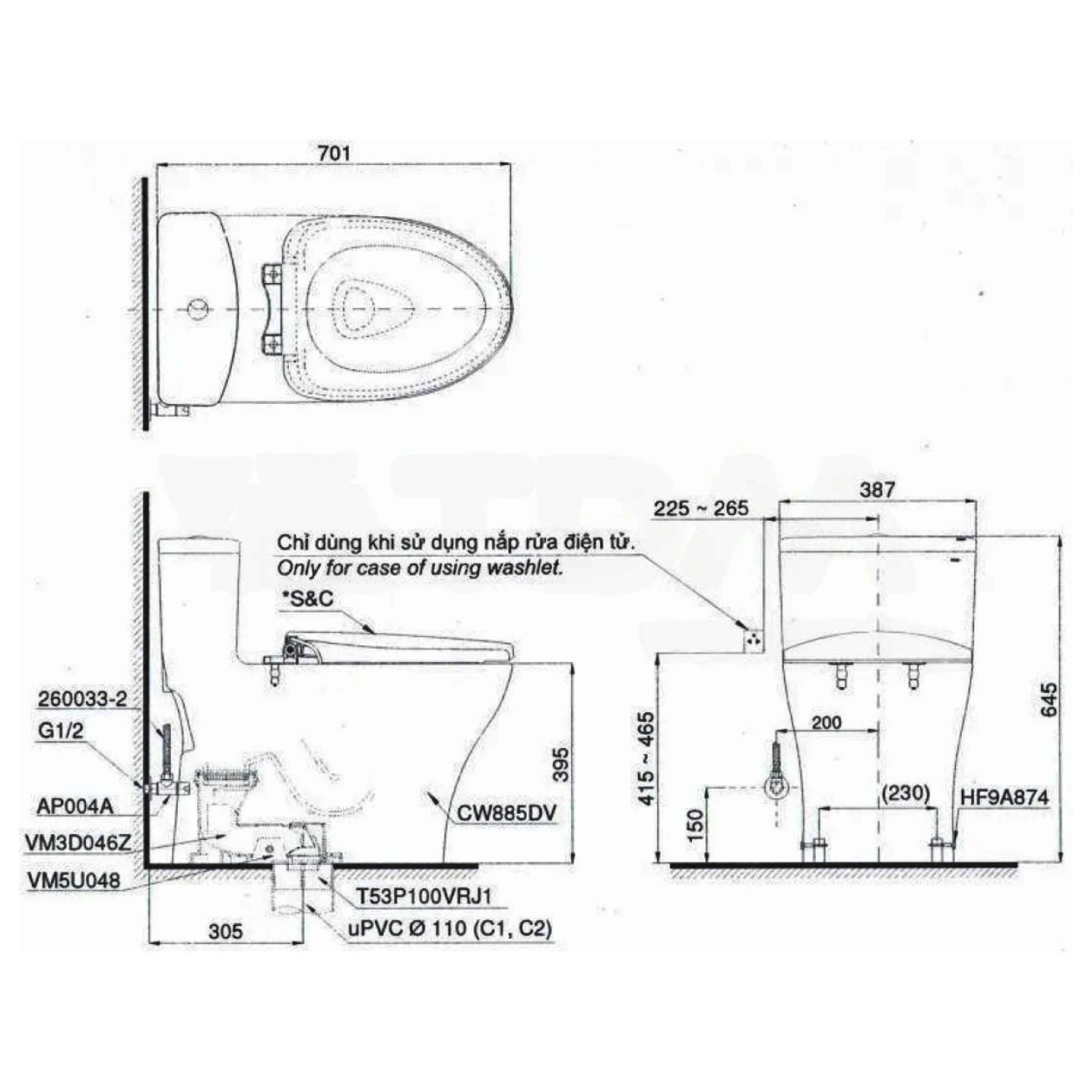 Bao gồm: Thân cầu C885D và Nắp bồn cầu TC385VS