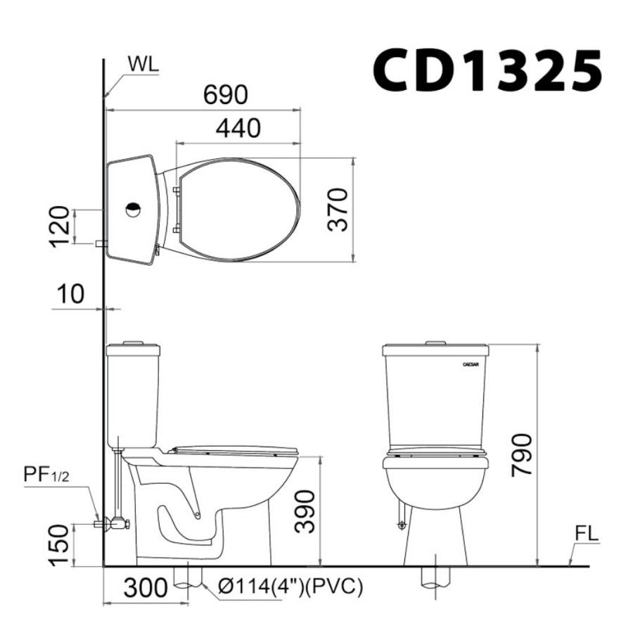 Bản vẽ kỹ thuật bồn cầu 2 khối Caesar CD1325 + TAF512H