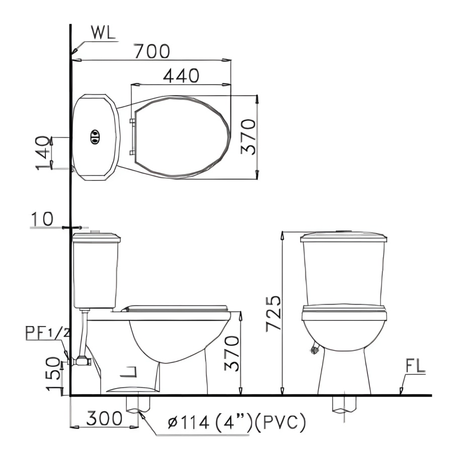 Bản vẻ Bồn Cầu 2 Khối Caesar CD1338 + Nắp Điện Tử TAF512H