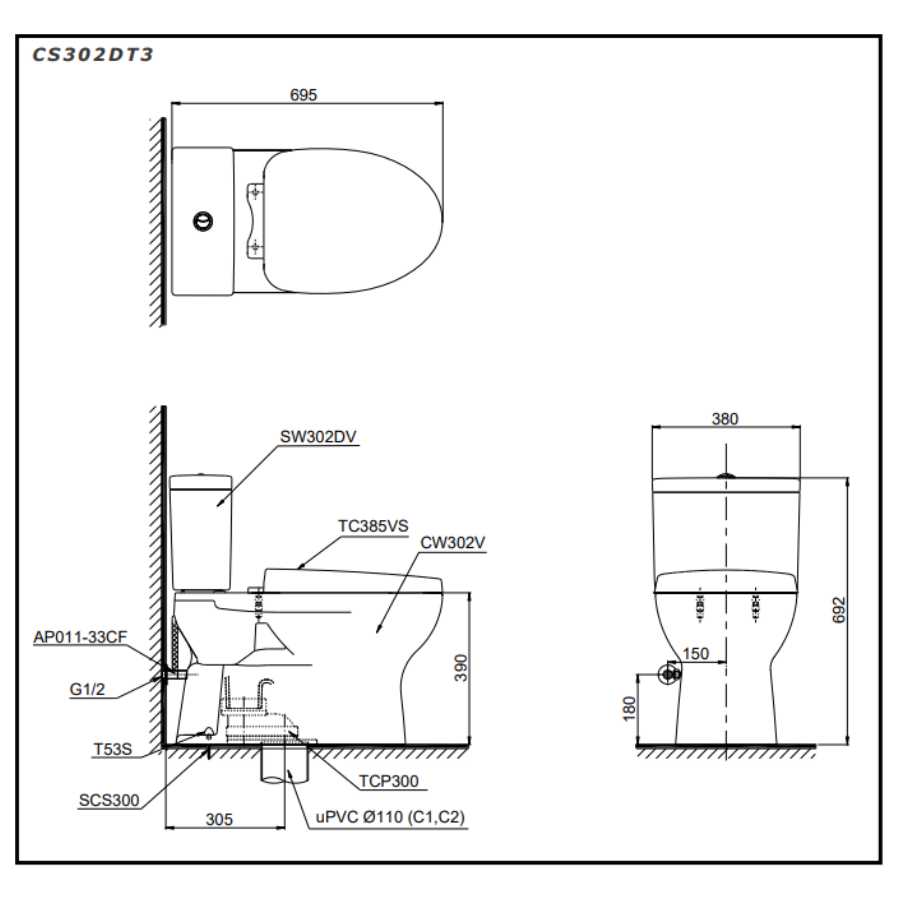 Bản vẽ kích thước Bồn Cầu 2 Khối TOTO CS302DT3