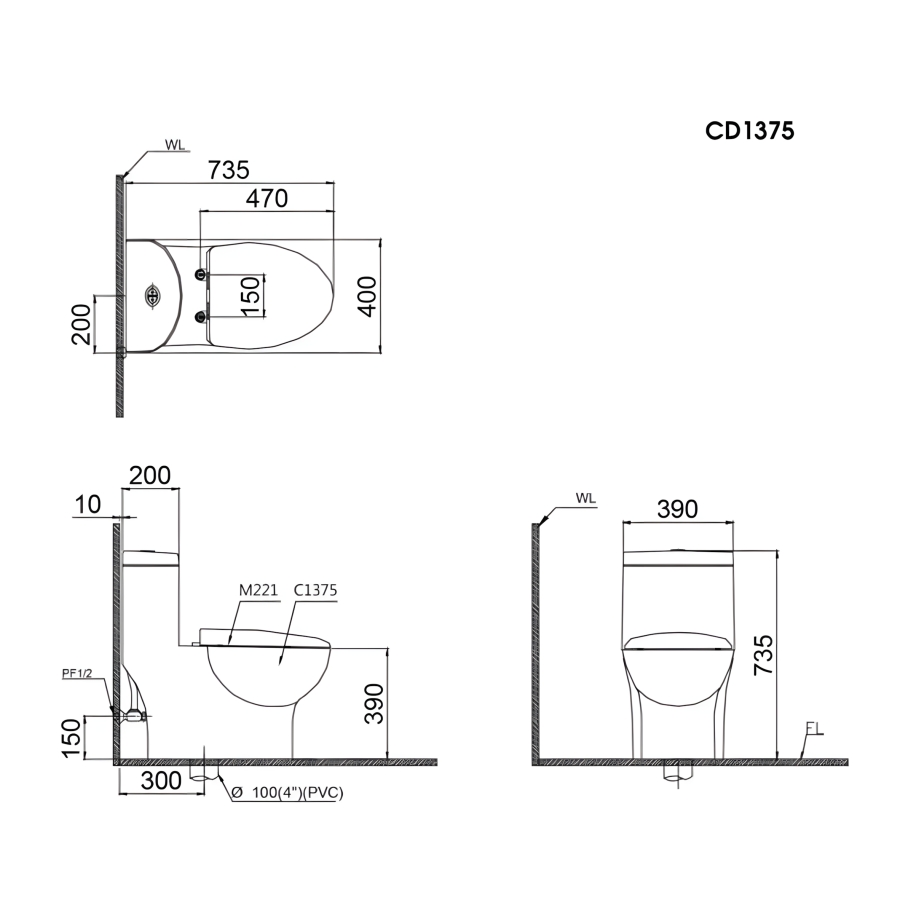 Bản vẽ Bồn Cầu CAESAR C1375 (CD1375) Một Khối Nắp Êm