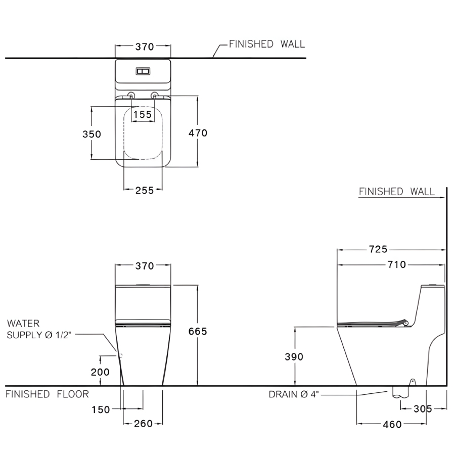 Bản vẽ Bồn Cầu COTTO C1032(MBK) 1 Khối Xả Nhấn Màu Đen