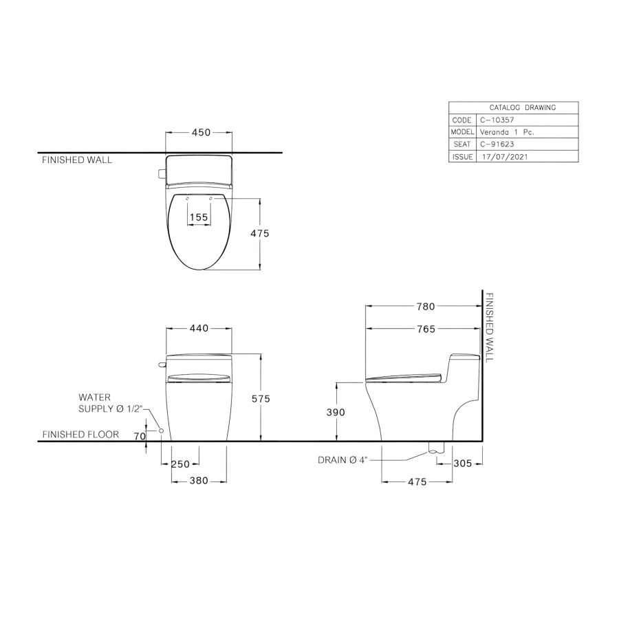 Bản vẽ kích thước bồn cầu C10357 1 khối Cotto