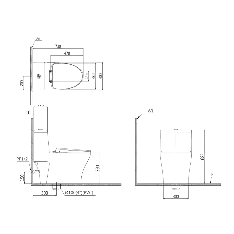 Bản vẽ kỹ thuật bồn cầu 1 khối nắp điện tử Caesar C1356F + TAF710H