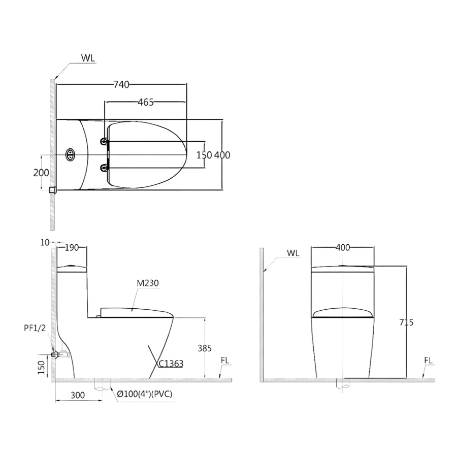 Bản vẽ Bồn Cầu Điện Tử CAESAR C1363F/TAF710H Có Remote