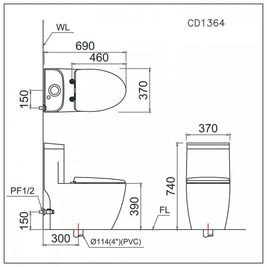 Kích thước bồn cầu (DxRxC): 690 x 370 x 740 mm