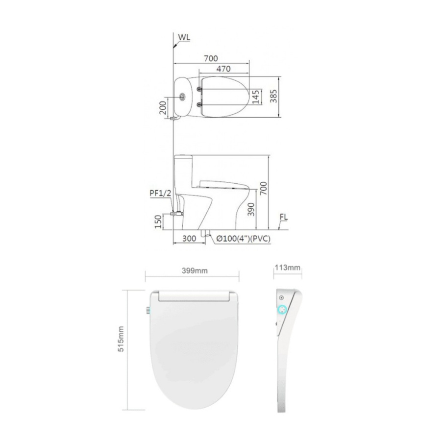 Bản vẽ kích thước bồn cầu C1394F nắp rửa TAF512H