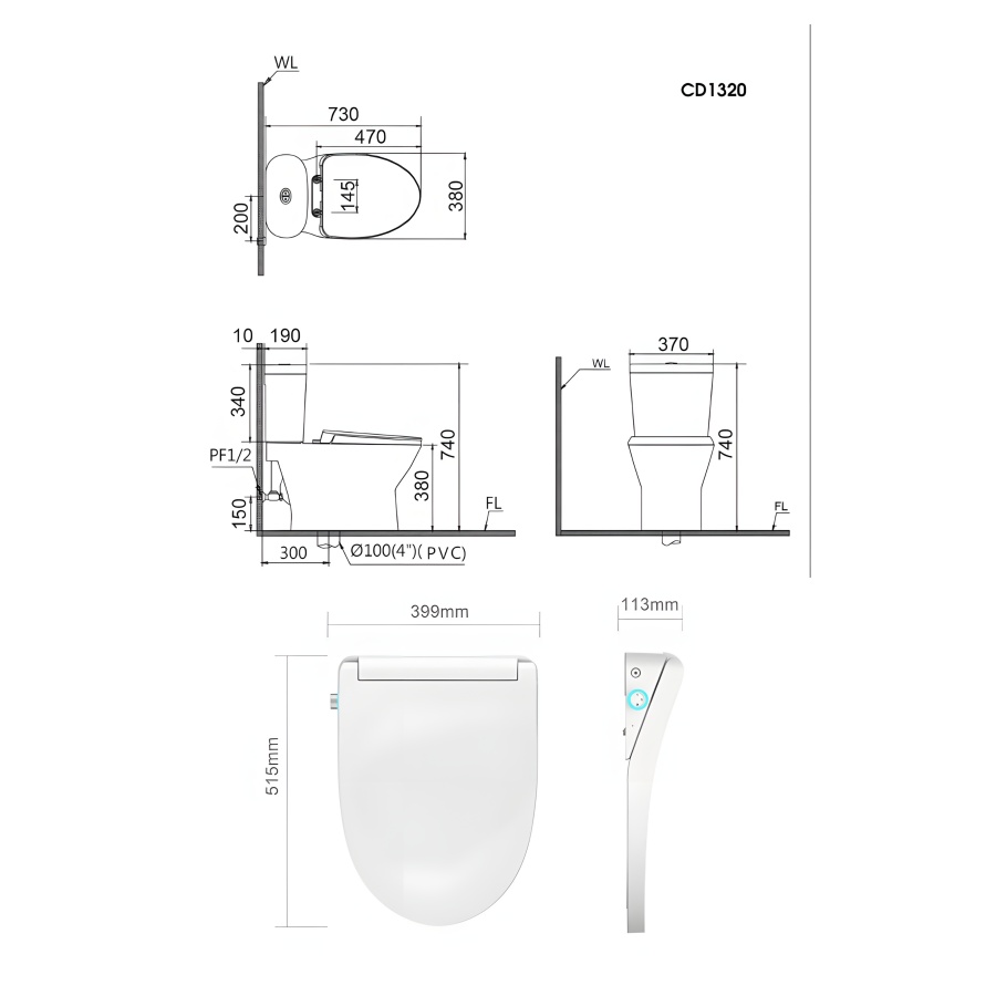 Bản vẽ kích thước bồn cầu thông minh CD1320-TAF512H Caesar