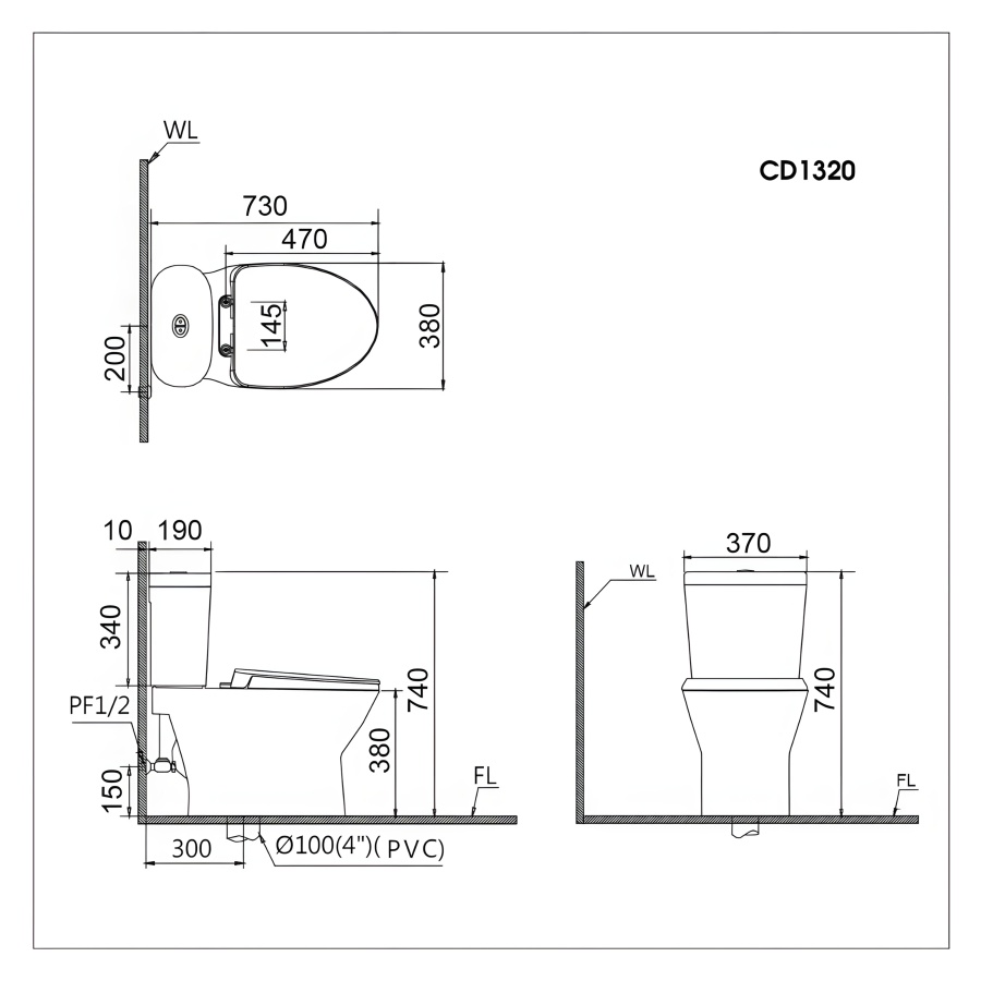 Bản vẽ kỹ thuật bồn cầu 2 khối nắp rửa cơ Caesar CD1320 + TAF710H