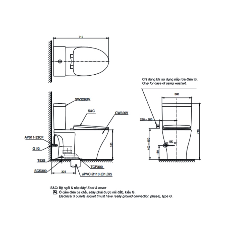 Bản vẽ kích thước bồn cầu điện tử TOTO