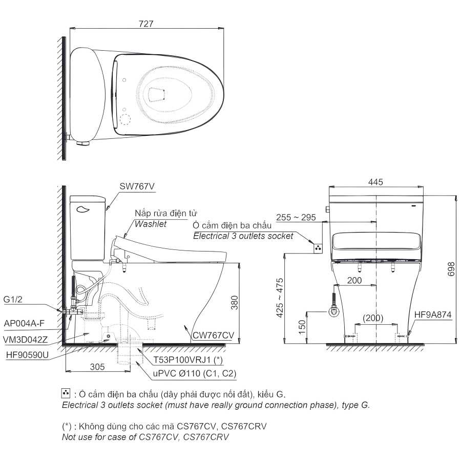 Bản vẽ Bồn Cầu Điện Tử TOTO CS767CRW12 (CS767CW12) Nắp Washlet Giấu Dây