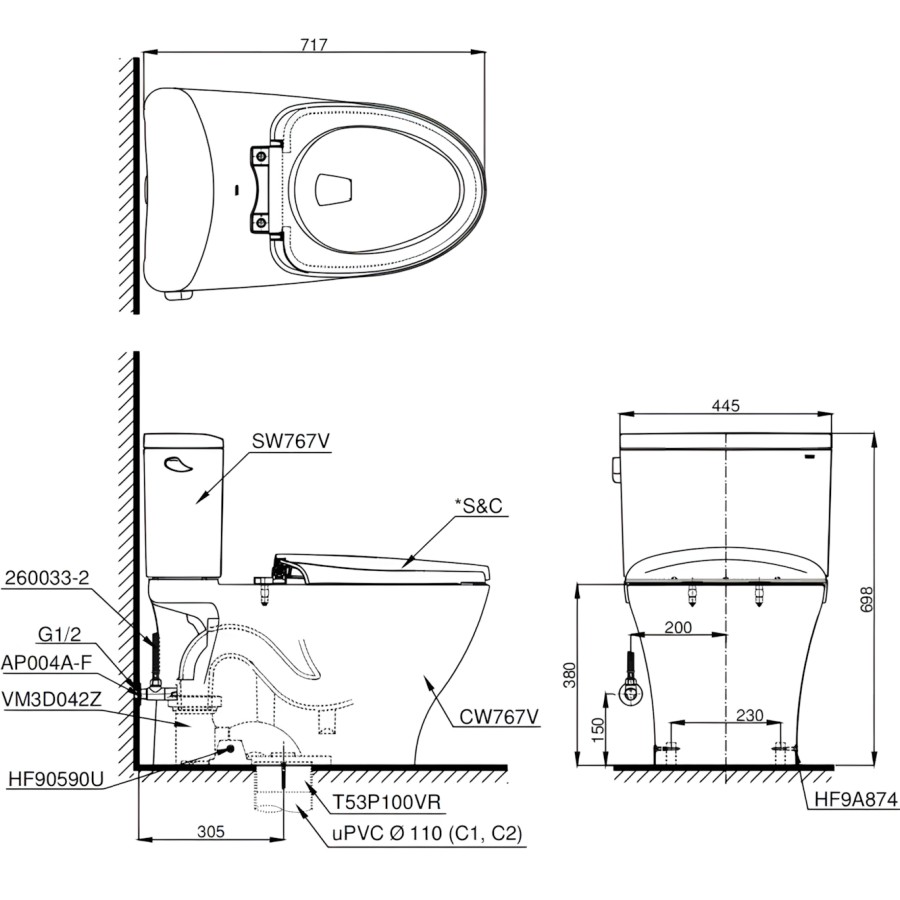 Bản vẽ Bồn Cầu Điện Tử TOTO CS767RW11 (CS767W11) Nắp Rửa Washlet