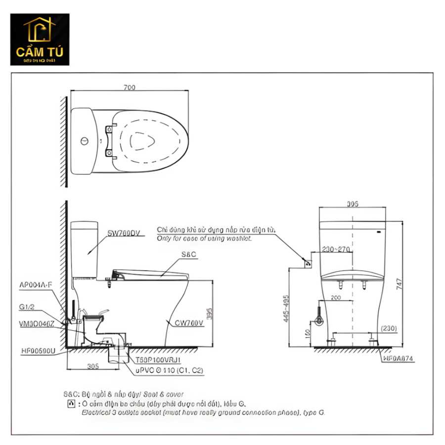 Bản vẻ Bồn Cầu Điện Tử TOTO CS769CDRW15 Washlet