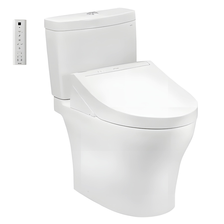 Điều khiển từ xa tiện lợi: Bồn cầu đi kèm remote cầm tay màu trắng (nhấn cơ) với 2 chế độ người dùng, dễ dàng tùy chỉnh mọi chức năng.