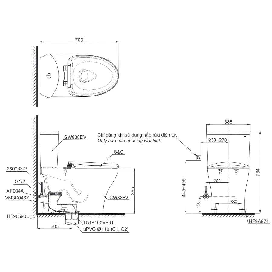 Phụ kiện đi kèm: Bộ cố định HF90590U, mũ chụp HF9A874, van dừng AP004A, dây cấp 260033-2, ống nối sàn VM3D046Z, đệm thoát sàn T53P100VRJ1, van khóa và gioăng đế.