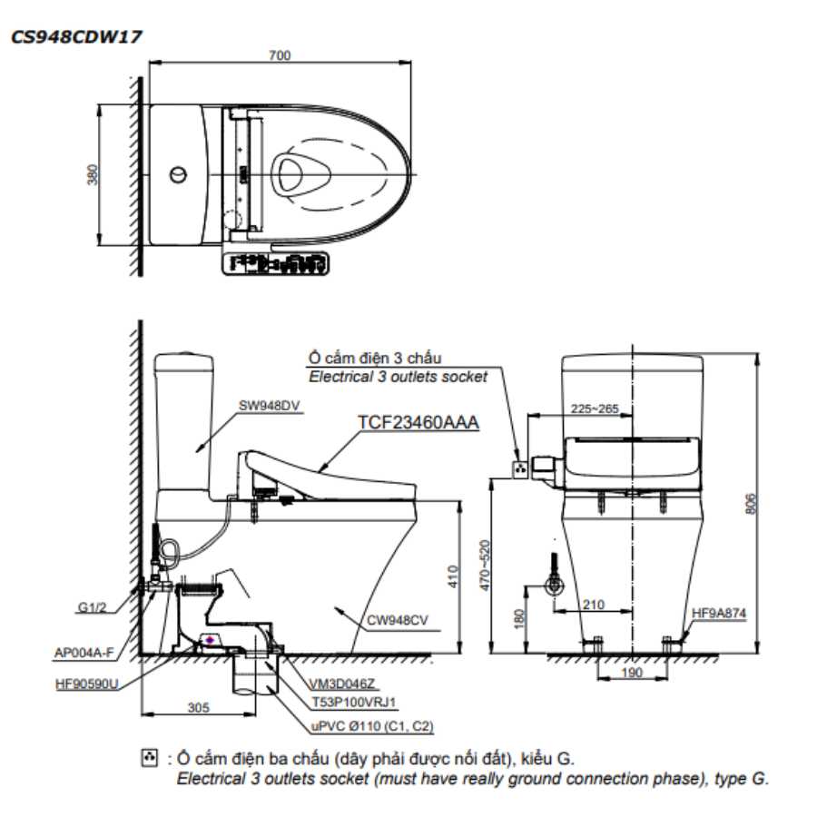 Bản vẽ kích thước bồn cầu điện tử TOTO CS948CDW17