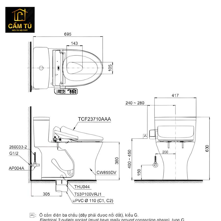 Bản vẽ Bồn Cầu Điện Tử TOTO MS855DW18 Nắp Rửa Washlet TCF23710AAA C2 Simple
