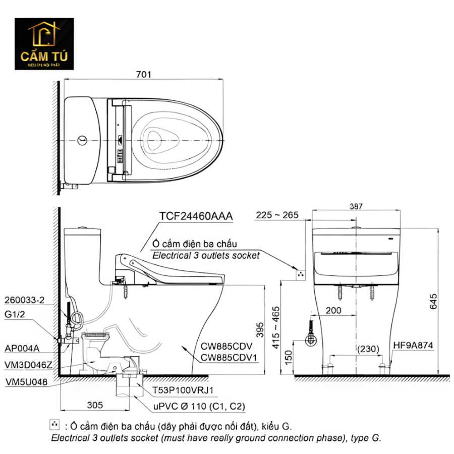 Bản vẽ Bồn Cầu Điện Tử TOTO MS885CDW15 Washlet