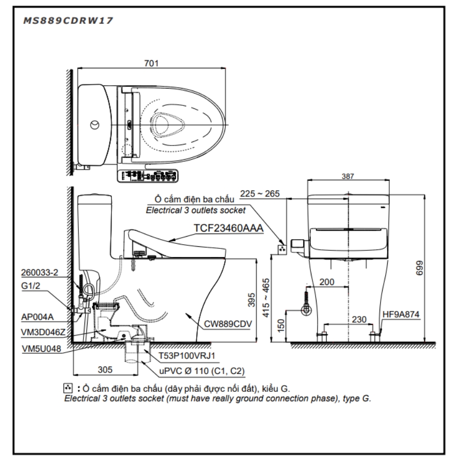 Bản vẽ Bồn Cầu Điện Tử TOTO MS889CDRW17 Nắp Rửa Washlet TCF23460AAA C2 Giấu Dây