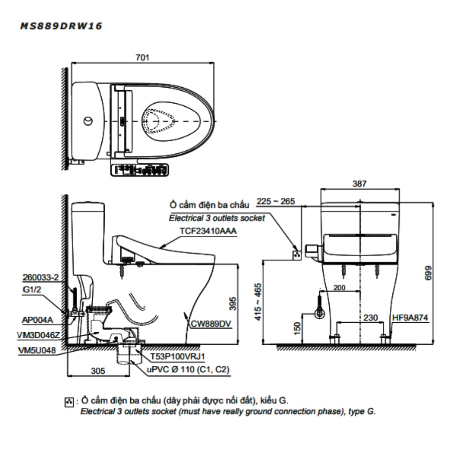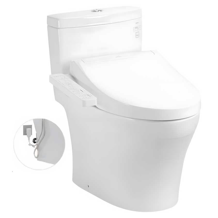 Cấu thành: Thân cầu C889DR (Việt Nam), Nắp bồn cầu điện tử TCF23410AAA (Malaysia).